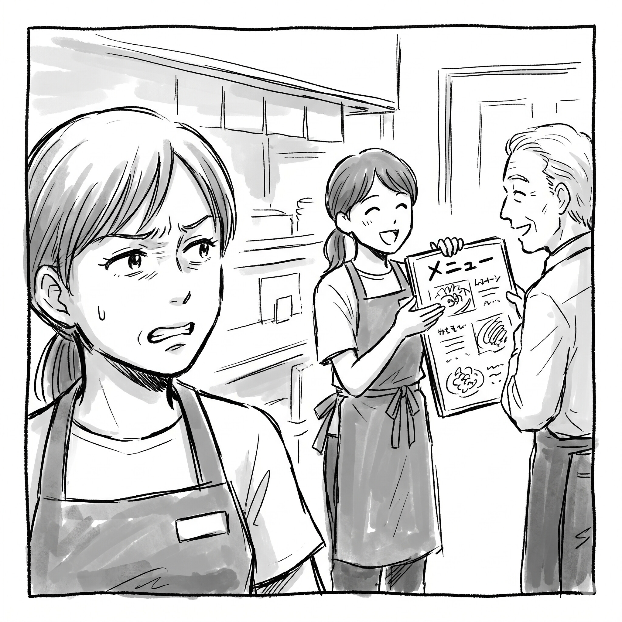 「この新メニュー表、私がデザインしておきました!」と私の手柄を奪う同僚。だが、新メニュー会議での店長の鋭い指摘でバレた話