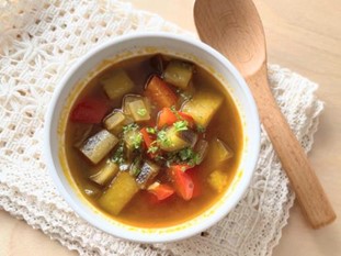 「ナスは熱を冷ますとともに血行を良くし、余分な水分を排出するので、むくみなどに効果的です。からだを冷やす作用もあるので、からだを温めて血液の流れをさらに促進する玉ねぎ、カレー粉、パセリを合わせ、ナスの寒性を和らげます。パプリカは気のめぐりを良くし、イライラや緊張をほぐす作用があるので、一緒に入れることでストレス緩和にも役立ちます」