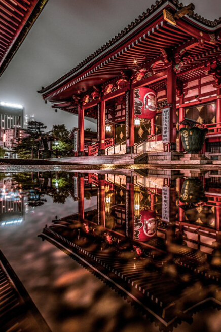 水面に映る提灯や建物の光がぼんやりと滲み、普段の浅草寺とは一味違う神秘的で迫力のある光景が広がっています。