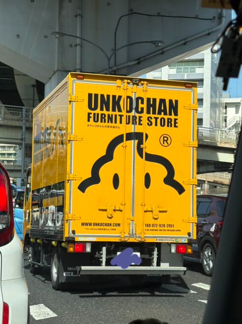 その車体には、「うんこちゃん」を連想させる愛嬌のあるキャラクターと「FURNITURE STORE」という文字が描かれていました。