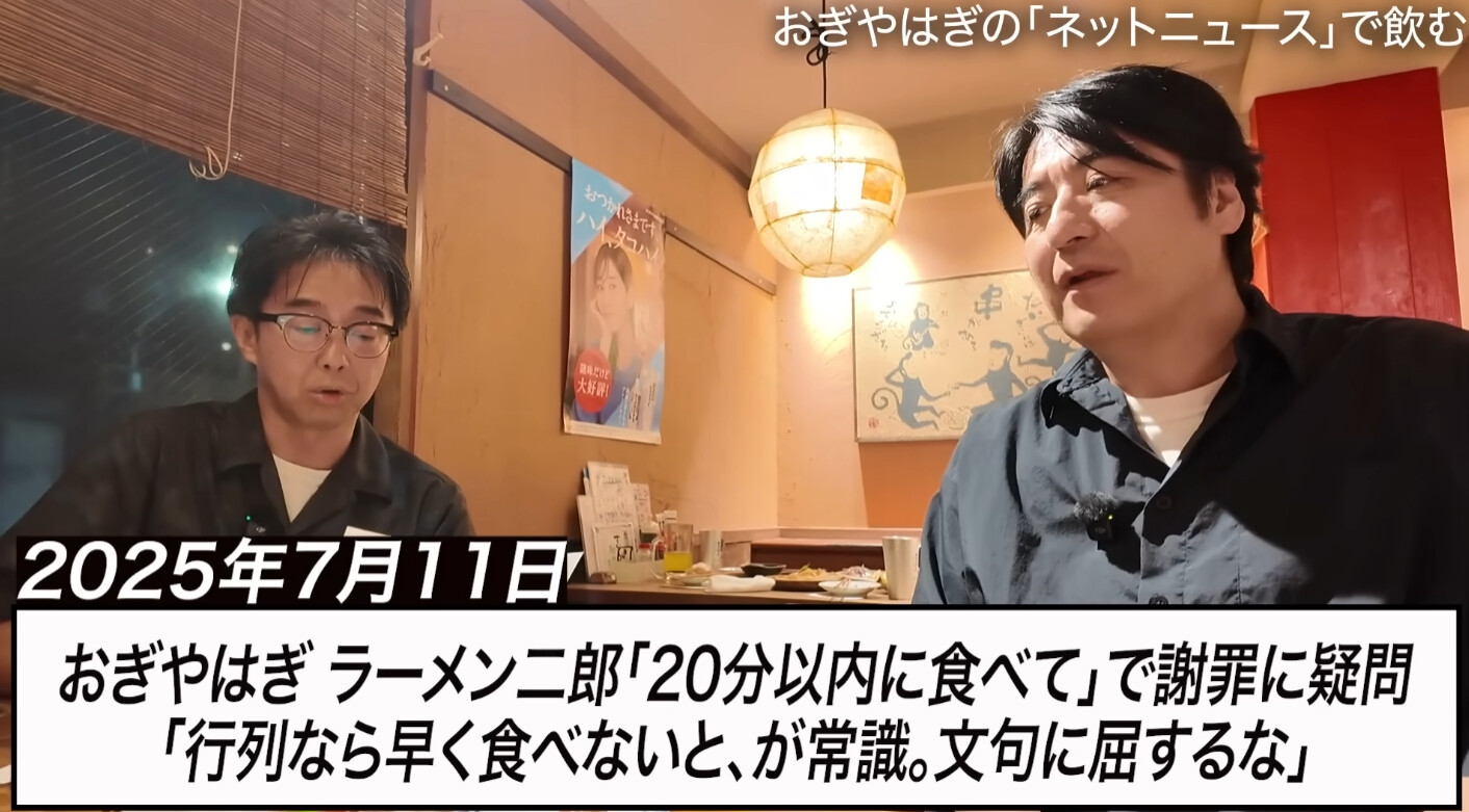 その中で、今年7月に報じられた「おぎやはぎ ラーメン二郎『20分以内に食べて』で謝罪に疑問」というニュースが取り上げられました。