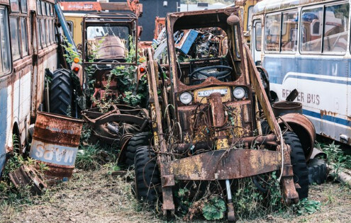 中央には、錆びつき、植物に覆われ始めている重機があり、その両脇には、同様に朽ち果てた古いバスが挟み込むように並んでいます。