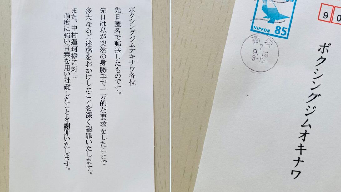 僕の所属するボクシングジム宛てに謝罪のハガキが届きました!この前届いた怪文書と同じ場所の消印だったので、同じ人物みたいです!皆さんが協力して拡散してくれたおかげです!本当にありがとうございました!今もSNSでは変な政党の人達に絡まれてますが、引き続き負けずに頑張ります! pic.twitter.com/LREXUe0lcp
