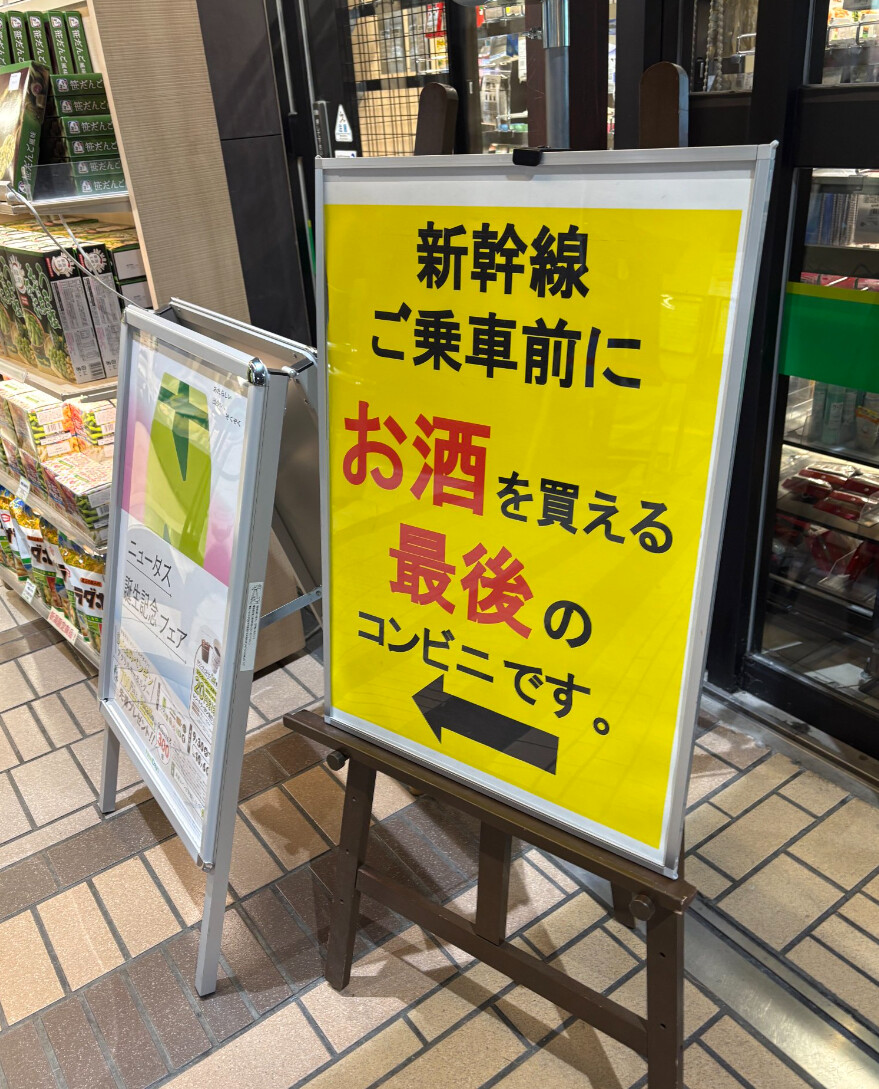 この売り文句は、新幹線に乗る前にお酒を購入できる最後のチャンスであることを強調。