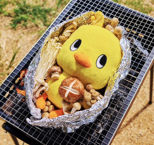 そこには、ひよこちゃんのぬいぐるみが、しめじやえのき、にんじん、そして十字に切り込みが入った椎茸といった秋の味覚と共にアルミホイルに包まれ、バーベキューコンロの網の上に乗せられている姿が写し出されています。