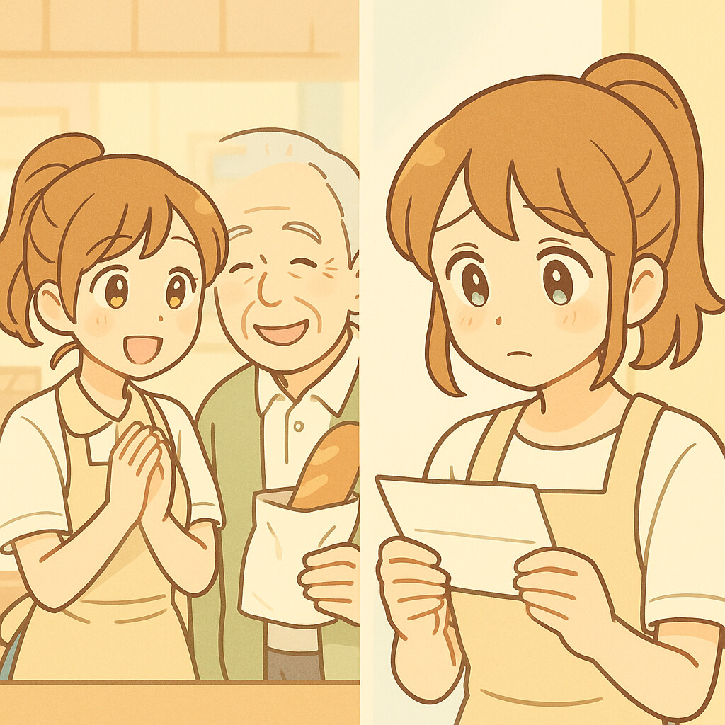 「昨日は、突然お釣りを辞退してしまい、申し訳ありませんでした。実は、私の妻が、あなたのお店で売っているあんパンが大好きだったのです。彼女は二年前に亡くなりました。私は、いつもあなたの明るくテキパキと働く姿に元気をもらっています。あのお釣りは、私からの感謝の気持ちとして、どうか受け取ってください。誰かに親切にされたら、また別の誰かに親切を分けてあげること。それが、私の妻が大切にしていた教えです。どうか、あなたの笑顔で、これからも多くの人を温めてあげてください。松本 」