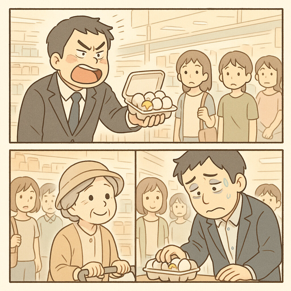 結局、男性は新しい卵を受け取ることも、それ以上何かを言うこともなく、割れた卵パックをその場に置くと、足早に店から出て行ってしまいました。