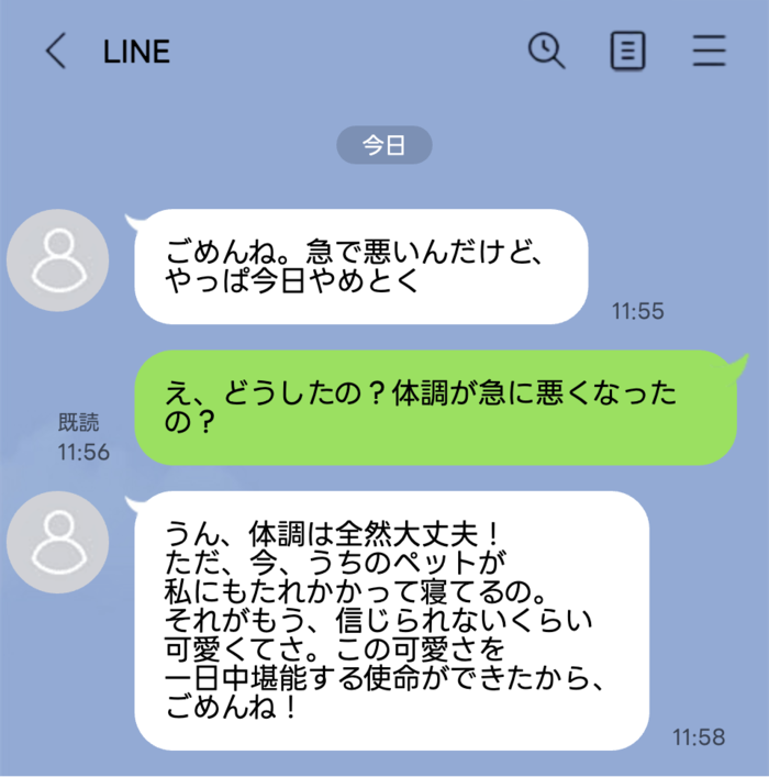 「うん、体調は全然大丈夫!ただ、今、うちのペットが私にもたれかかって寝てるの。それがもう、信じられないくらい可愛くてさ。この可愛さを一日中堪能する使命ができたから、ごめんね!」
