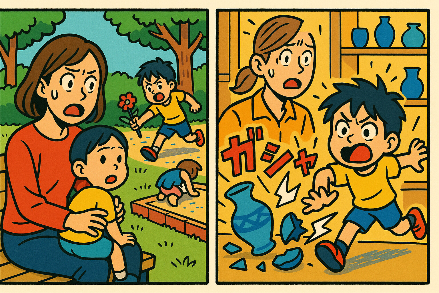 男の子が、店内を走り回ったあげく、一番目立つ場所にあった高価そうな陶器のディスプレイを、棚ごと倒してしまったのです。