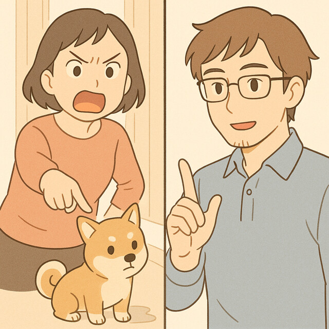 「ちょっと奥さん!この犬、うちの玄関の前で粗相したわ!躾がなってない!」