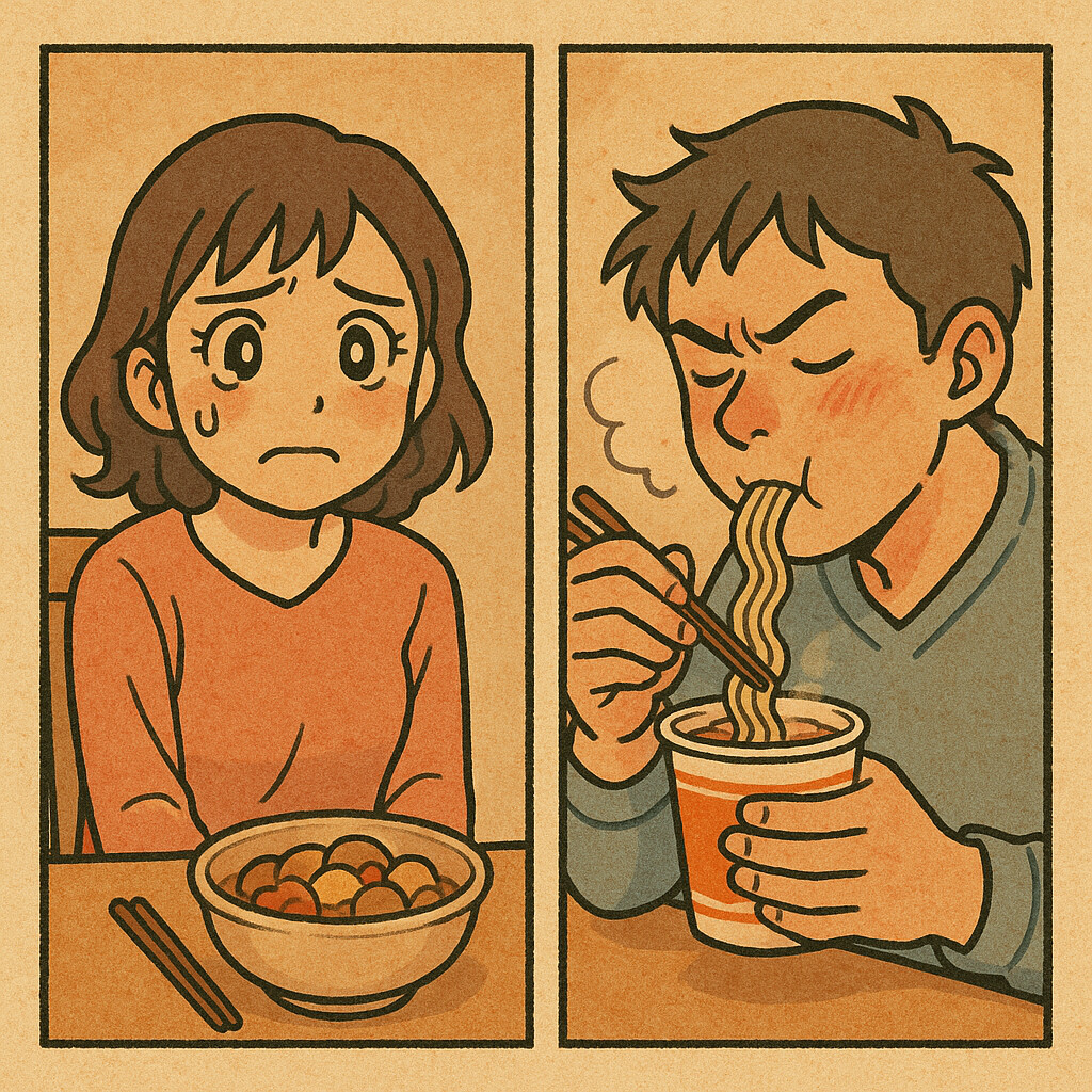 「やっぱりこれだよな。お前の飯より、よっぽど味がしっかりしてて美味い」私の目の前で、刺激臭を漂わせながらズルズルと音を立ててカップ麺をすする夫。