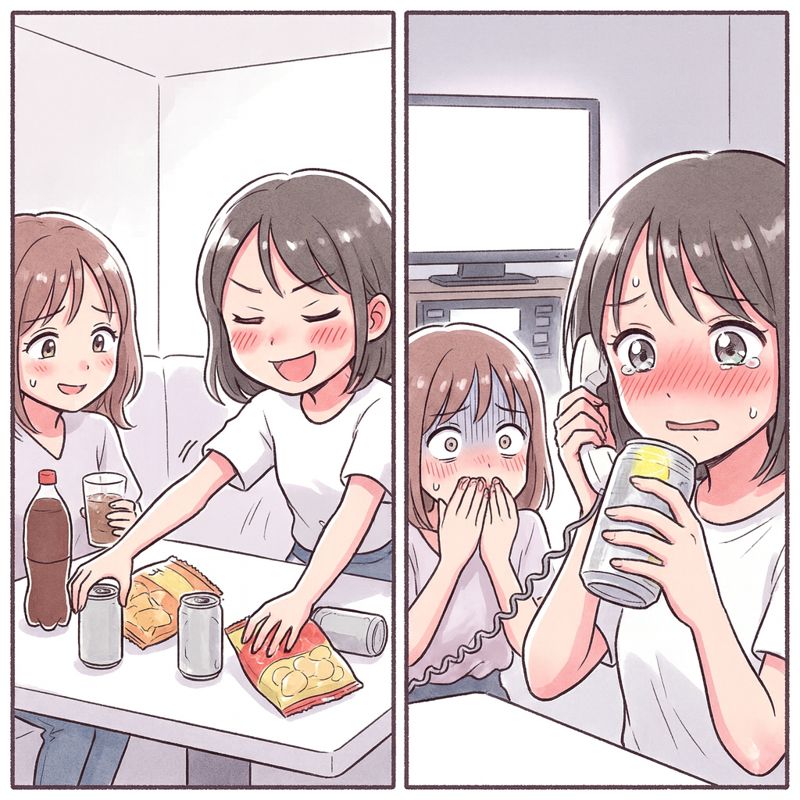 部屋に入ると、友人は「ほらね、余裕!」と勝ち誇った顔で、隠していた缶ジュースとおつまみをテーブルに広げ始めました。