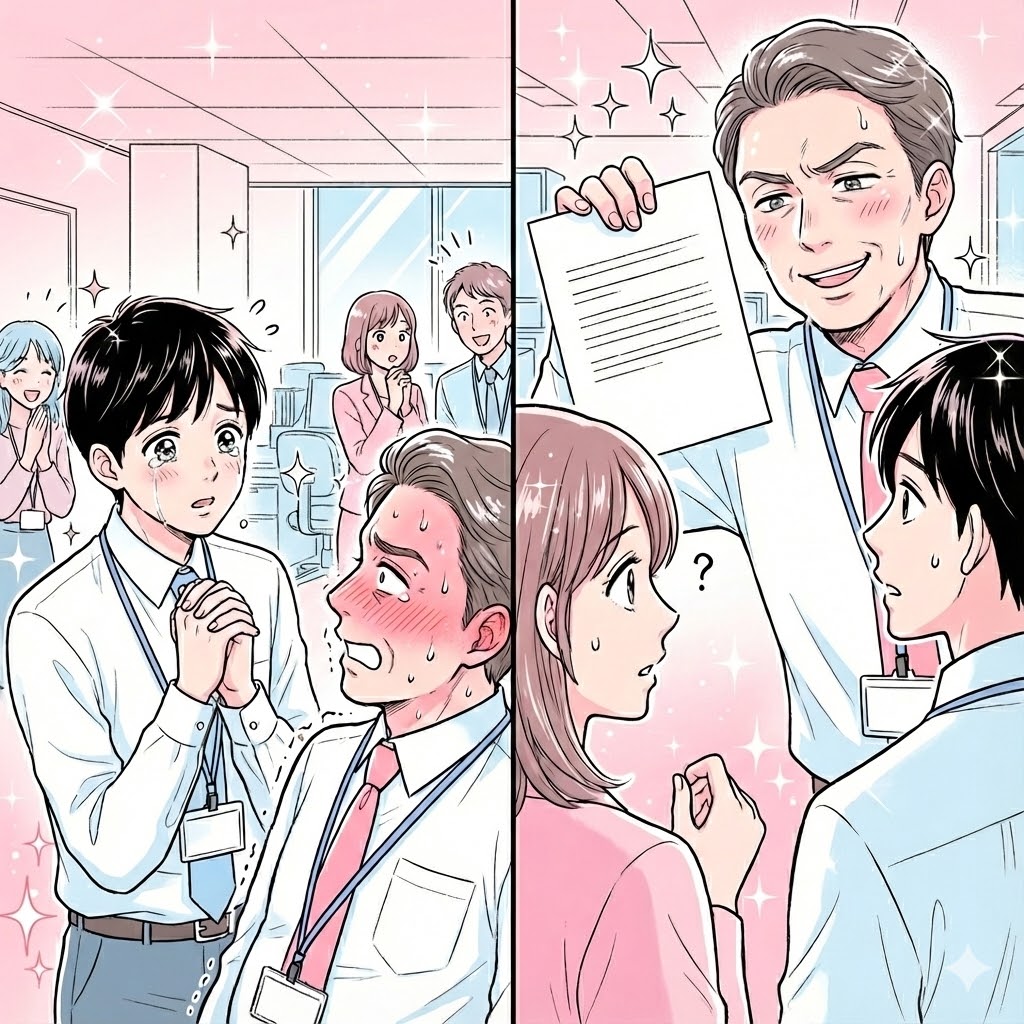 課長が自慢げに語ったその時、新人くんは「ああっ!」と大きな声を上げ、涙ぐんだ瞳で課長を見つめながら言いました。
