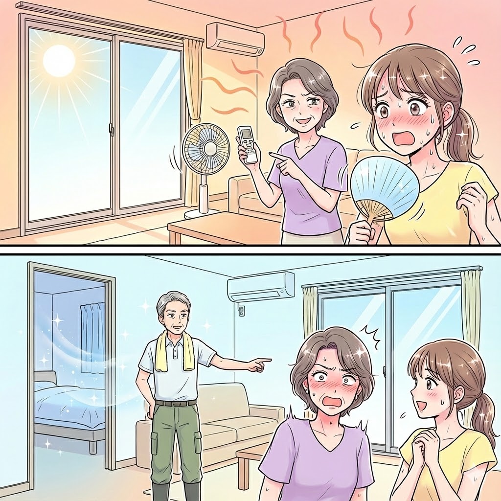 「ちょっと! エアコンなんて贅沢よ。窓を開けて扇風機を回せば十分涼しいでしょ?」