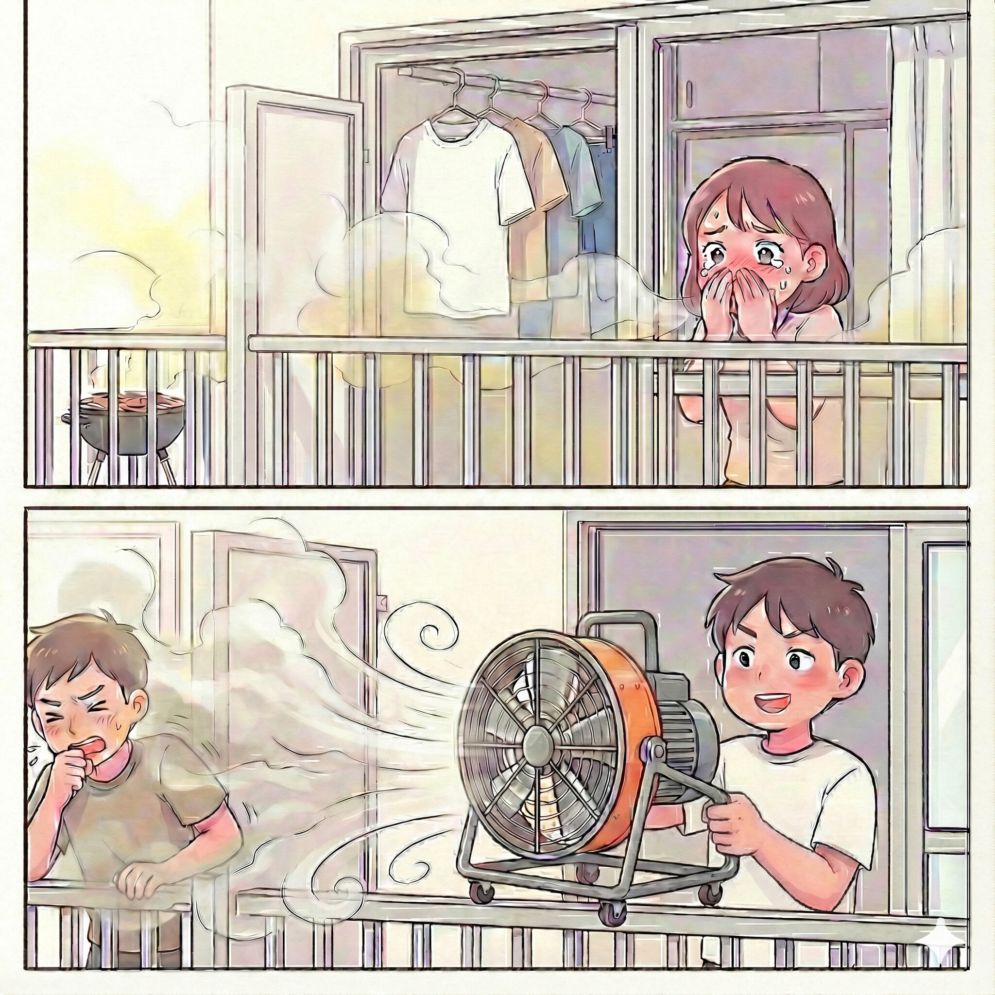 夫がベランダに持ち出したのは、工事現場や体育館で見るような、巨大な業務用の「扇風機」でした。夫はそれを隣のベランダとの仕切り板ギリギリに向け、スイッチを最大風量でオンにしました。
