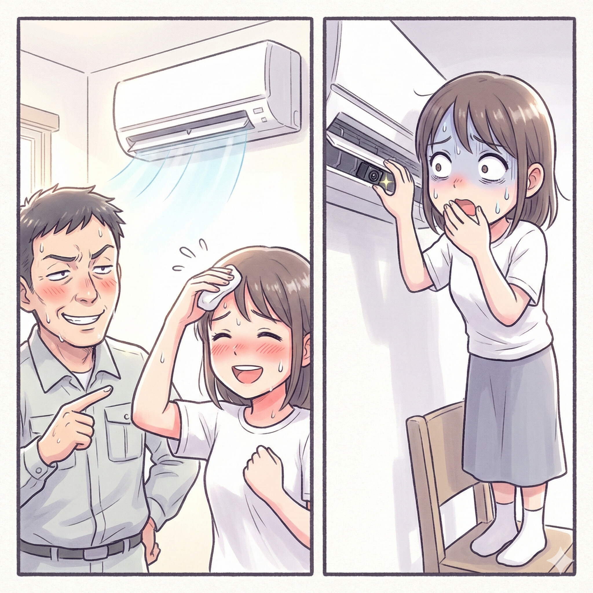 一時間後、「直ったよ!これで快適だ」と、彼は満足げに部屋から出てきました。確かに冷たい風が出ており、私は何度も頭を下げて感謝しました。