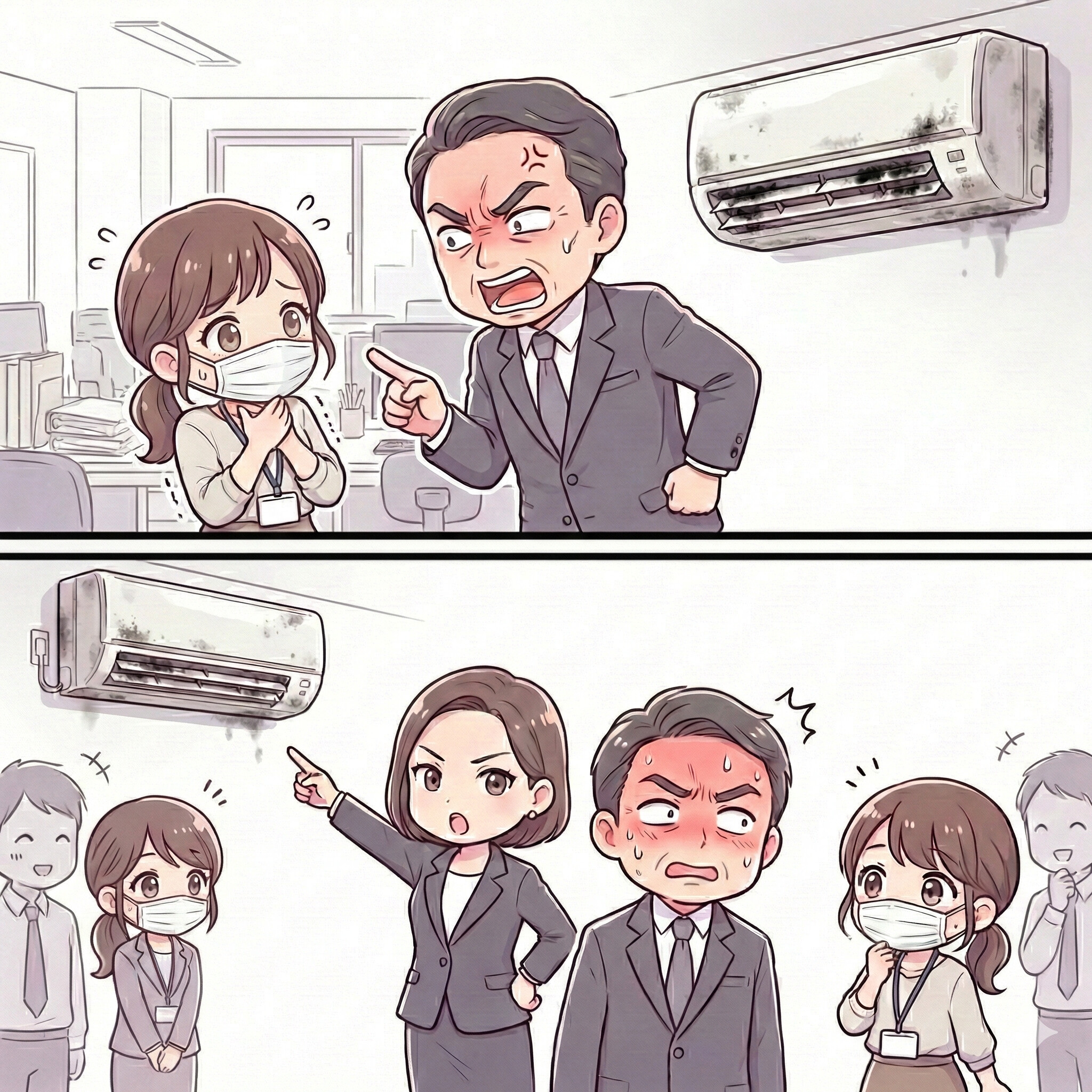 「彼女が体調を崩したのは、自己管理のせいじゃありません。見てください、あの吹き出し口。真っ黒なカビがびっしり生えています。この臭いも異常ですよ。フィルター掃除すら何年も放置されていますよね」