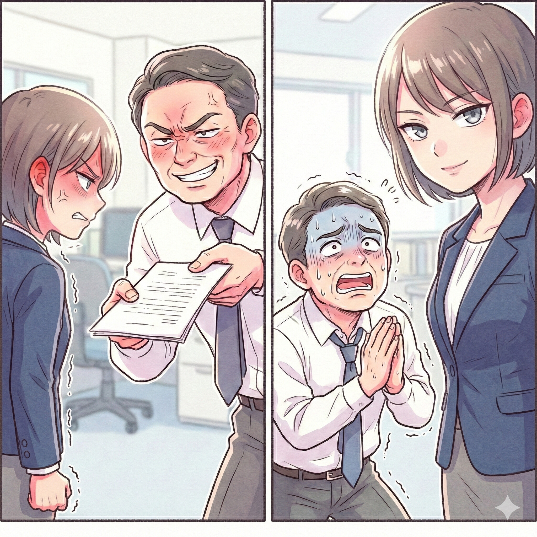 上司の額から、滝のような汗が流れ落ちました。彼はガタガタと震える手でネクタイを緩め、消え入りそうな声で言いました。