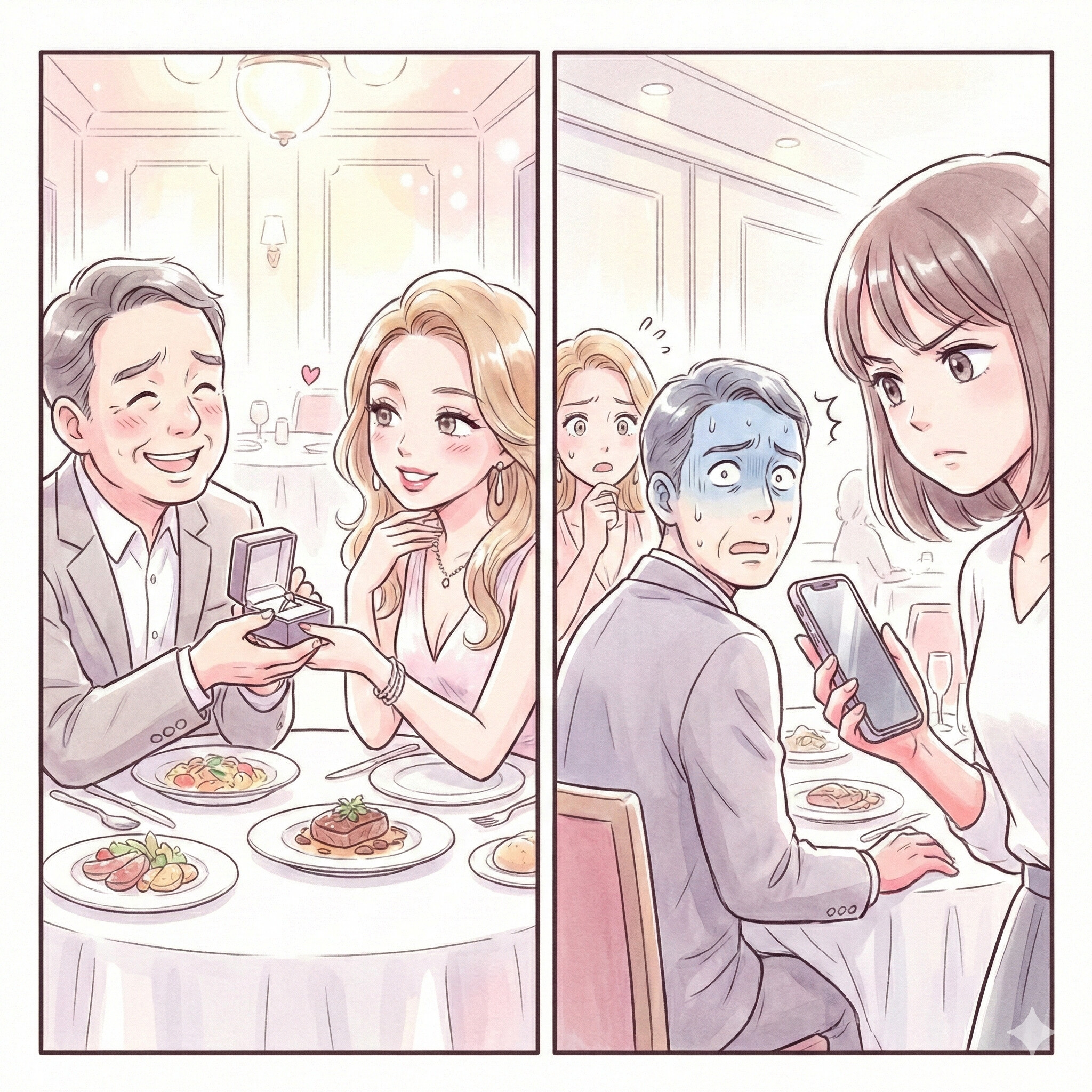 私は震える手で店内の様子をうかがいました。二人は乾杯し、父は彼女に小さな箱を差し出しました。中身は高級ブランドのアクセサリー。