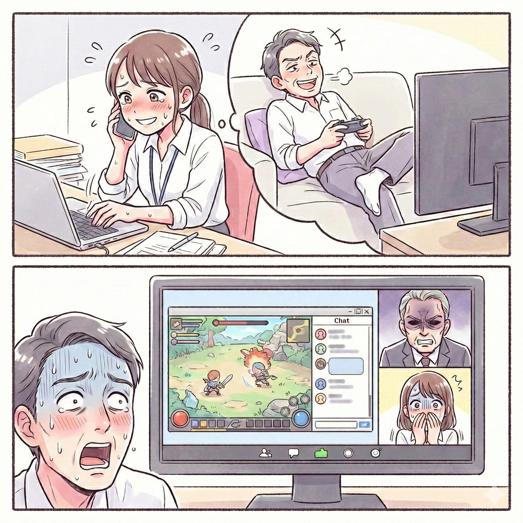 静まり返る会議。先輩は慌てて画面を消そうとしましたが、操作を誤って今度は動画サイトの視聴履歴まで晒してしまいました。