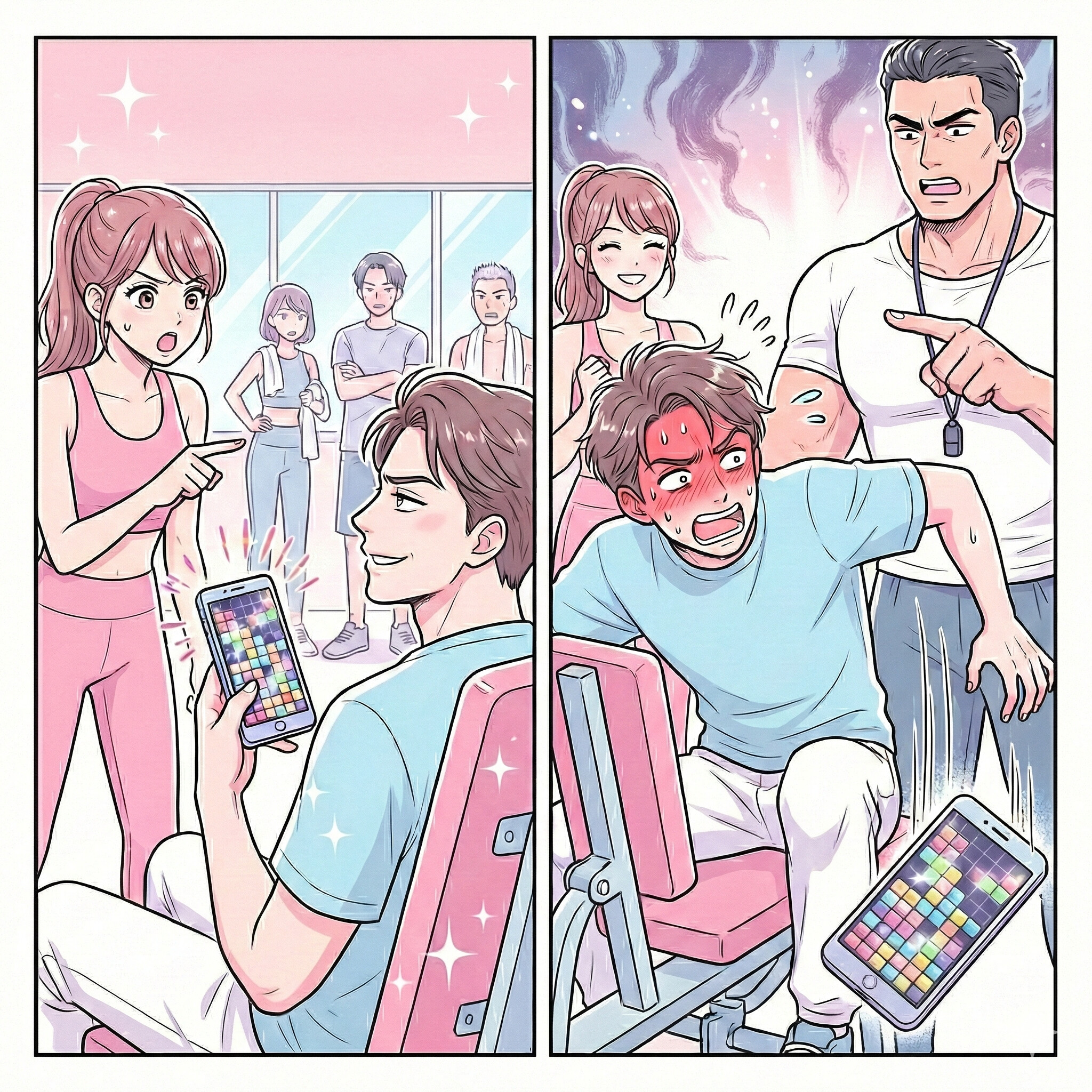 しかし、彼のスマホ画面をよく見ると、流れていたのはトレーニング動画ではなく、派手なエフェクトが飛び交うパズルゲームだったのです。