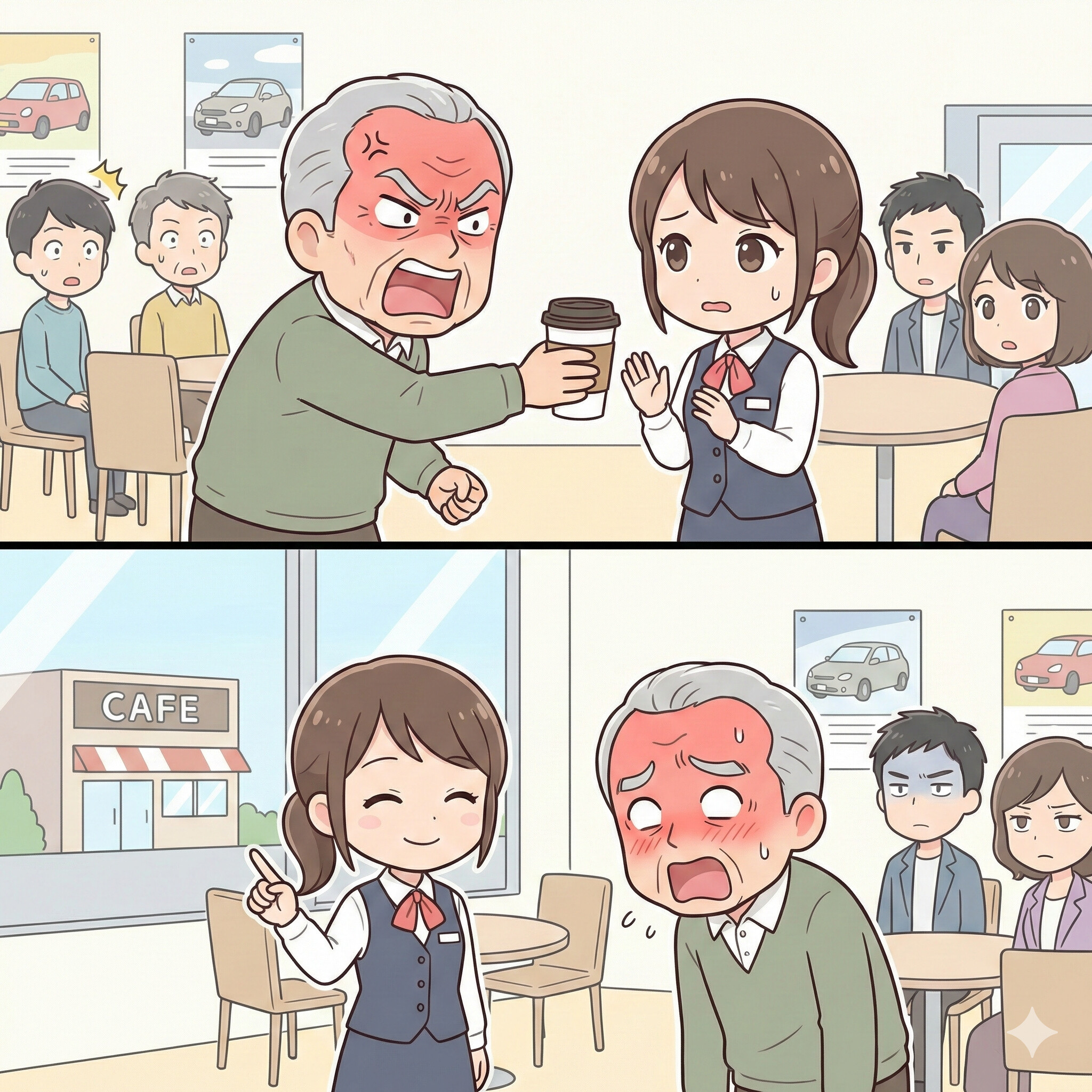 「申し訳ございません。ですがお客様、こちらはカフェではなく、あくまで『車の販売所』でございます」