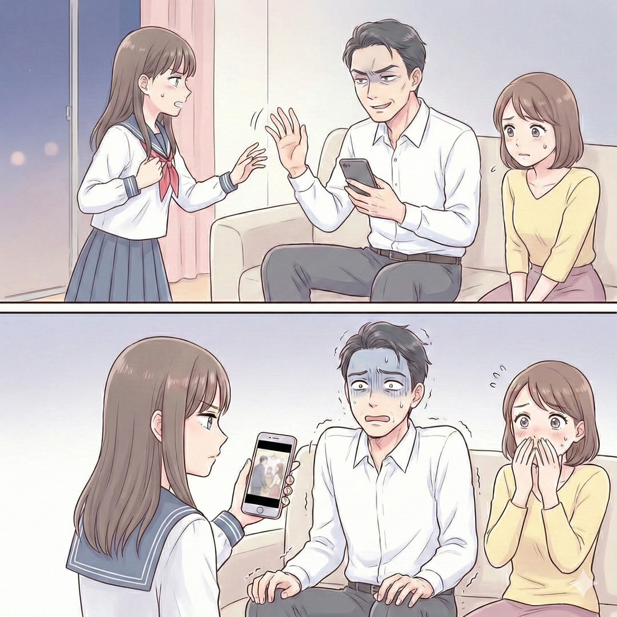「先週の火曜日、駅前のカフェで綺麗な女の人と手を繋いでいたよね。パパ、あんな高いお店でケーキまでご馳走してた。私は全部見ていたし、動画も撮ってあるよ。これ、今ここでママと一緒に見てもいいのかな?」