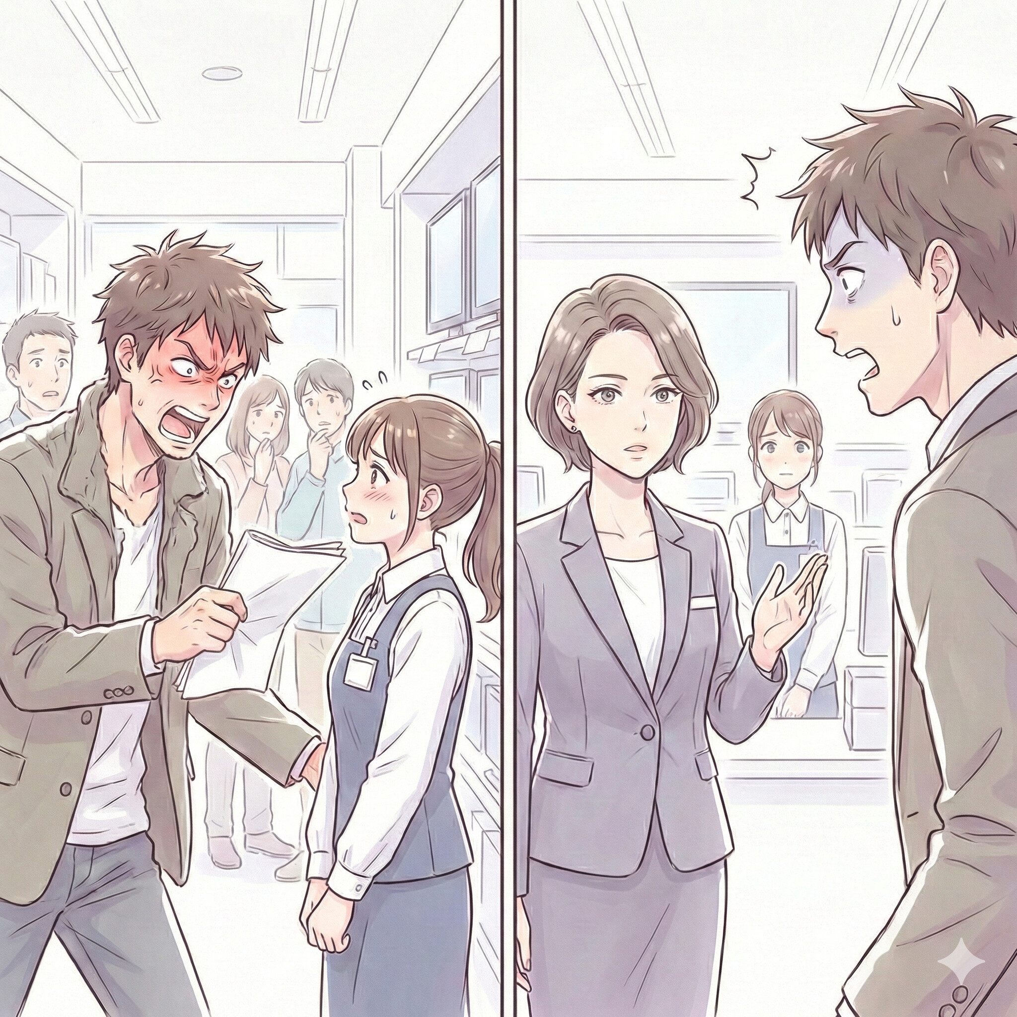 私が対応に窮し、途方に暮れていたその時、奥から店長が出てきました。店長は冷静な表情で、騒ぐ男性の前にスッと立ちました。