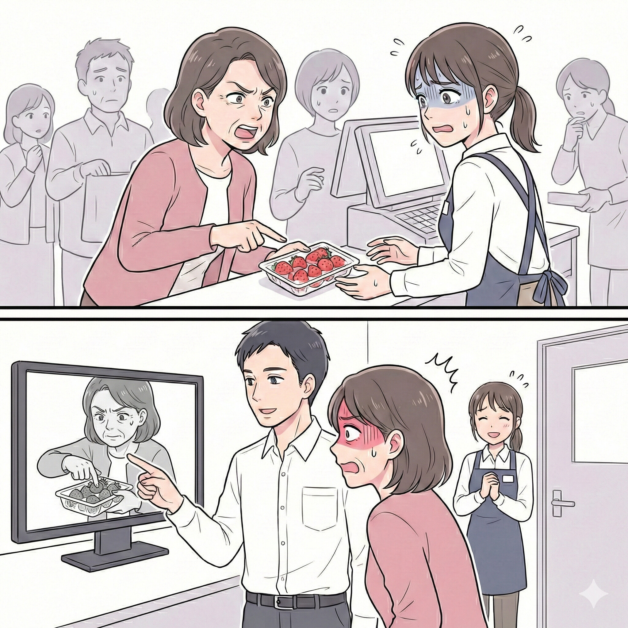「そんなの時間の無駄よ!」と騒ぐ彼女を店長が宥め、事務室のモニターを確認しました。