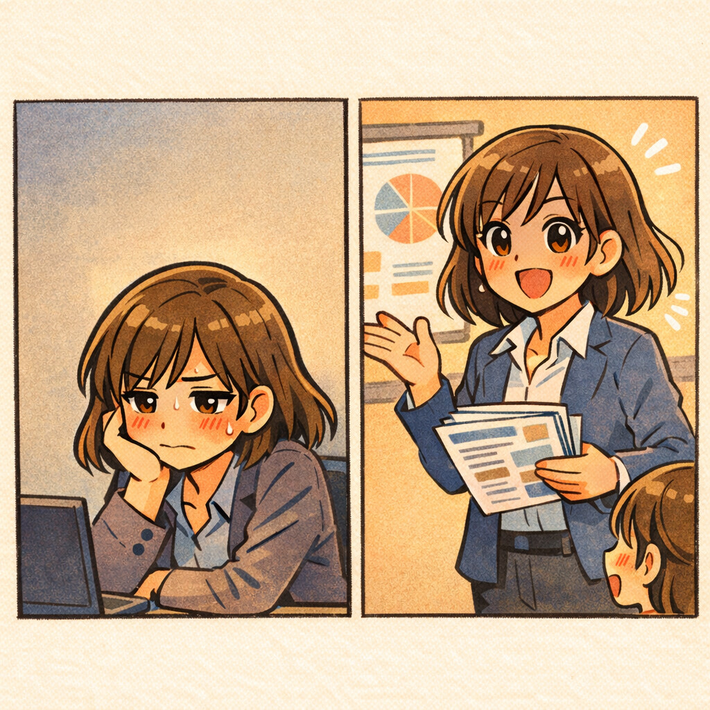 「今回の新プロジェクトですが、実は私が一から考えた案なんです」