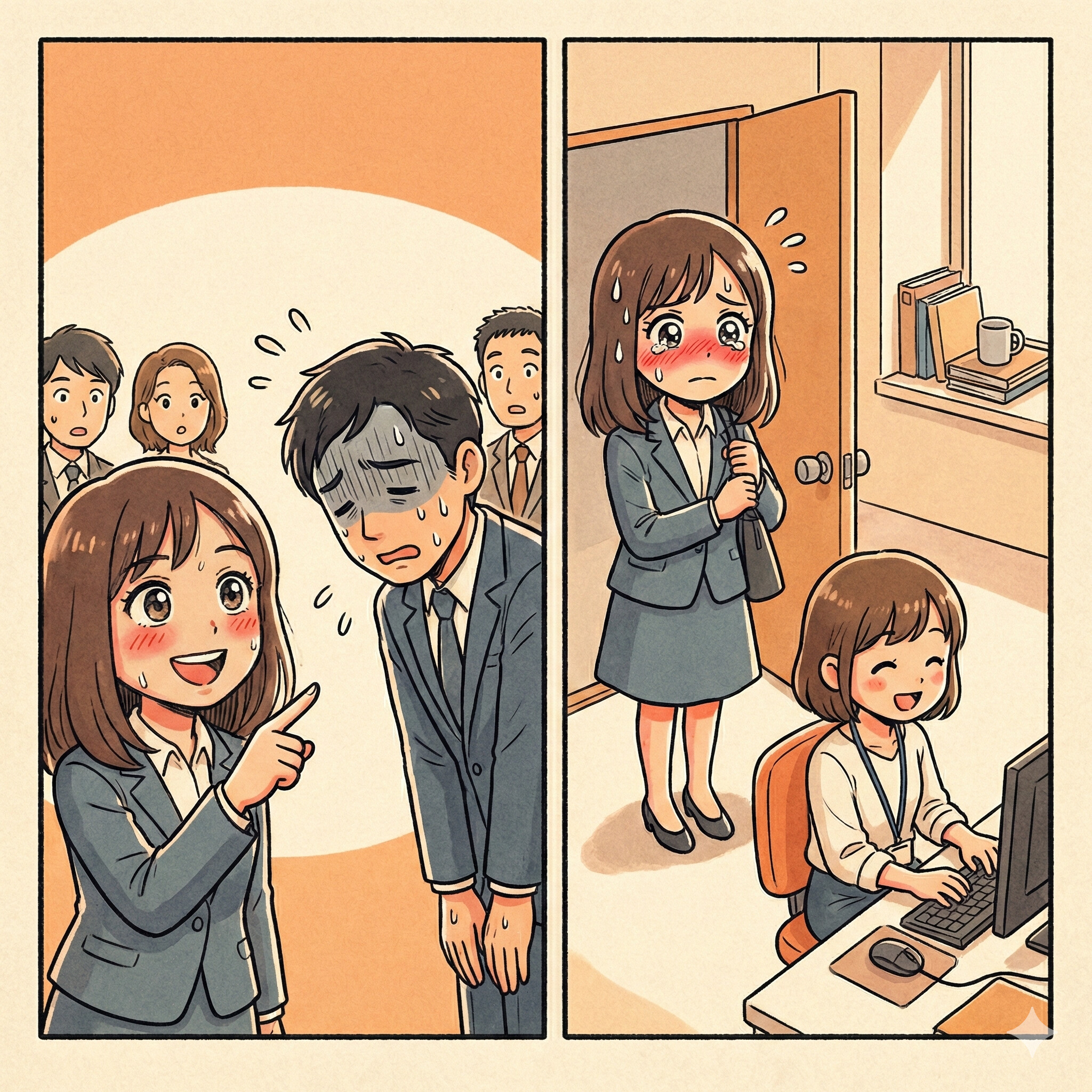 「私が最終チェックしてあげる」と言いながら手柄を奪う先輩。だが、資料に潜んでいた罠に気づかず大目玉を喰らう