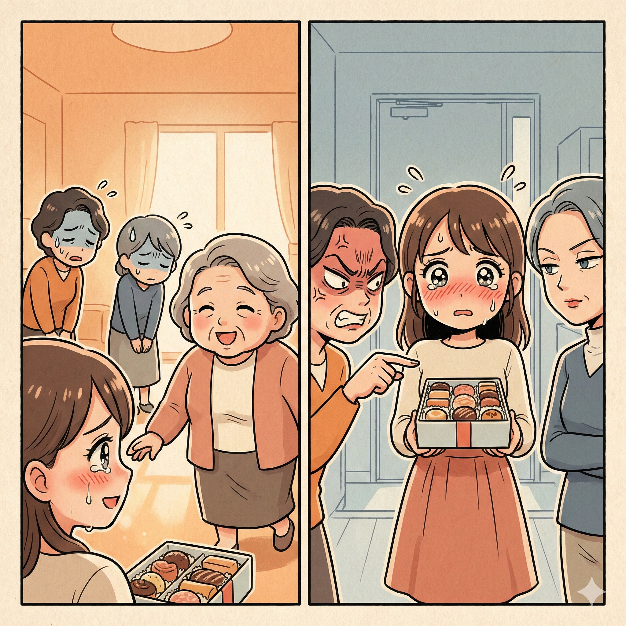 「あら、やだ!お義母さん、この間の検査で糖尿の気があるって言われたのよ?甘いものは目の毒だからやめてって言ったじゃない!あなた本当に気が利かないわね」