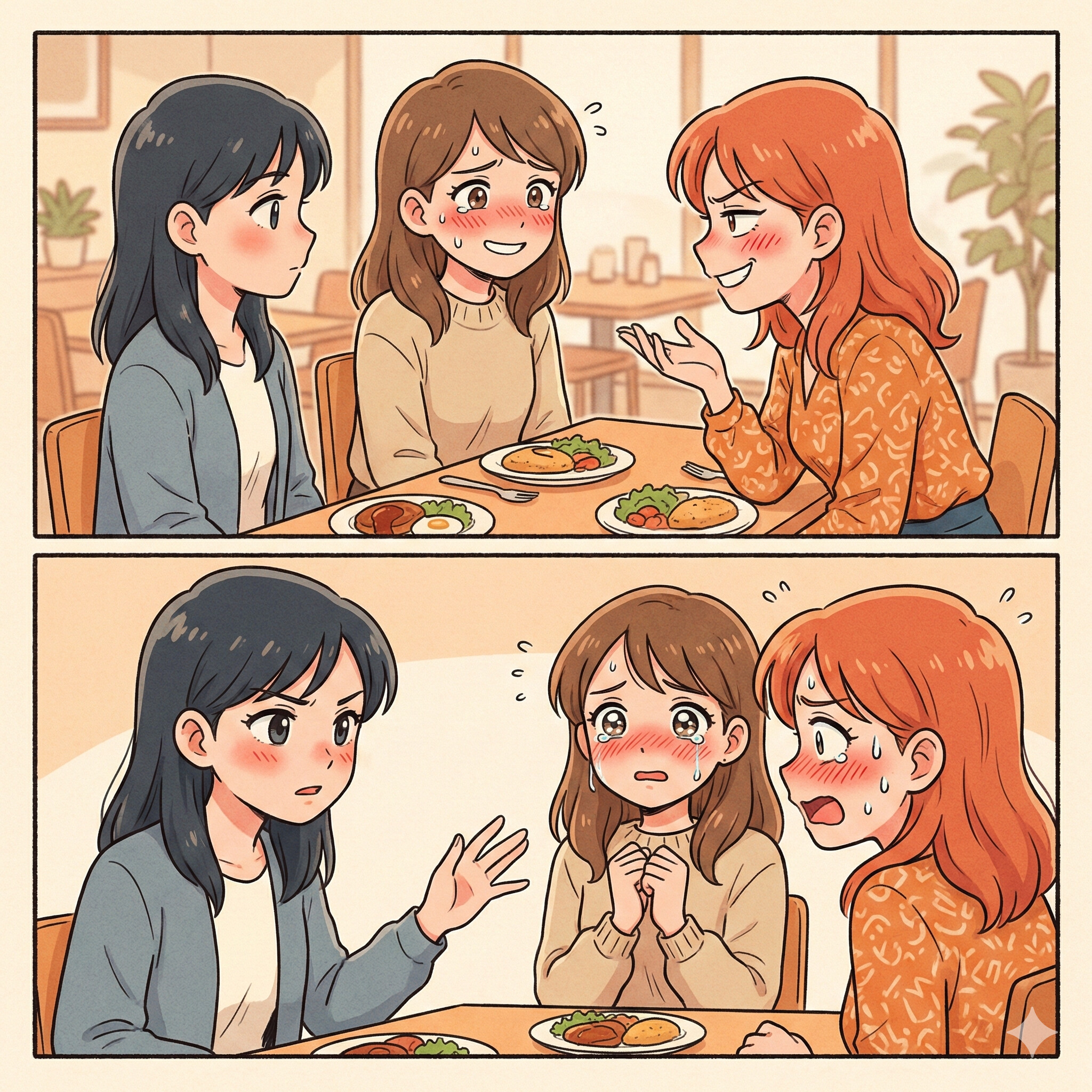 その後、話題は自然と変わり、ランチ自体は穏やかに終わりましたが、帰り際の彼女は少し気まずそうにしていました。