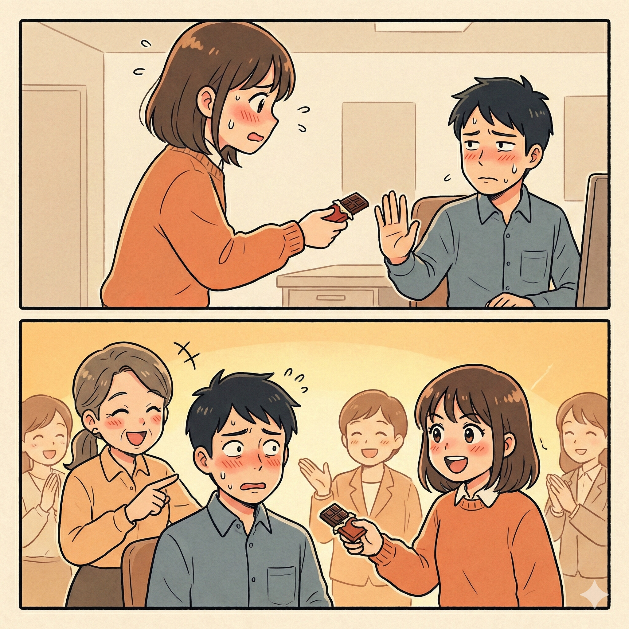 「お菓子配らなくてもいいのに」職場でお菓子を配る私を否定する同僚。だが、先輩の一言に救われた話
