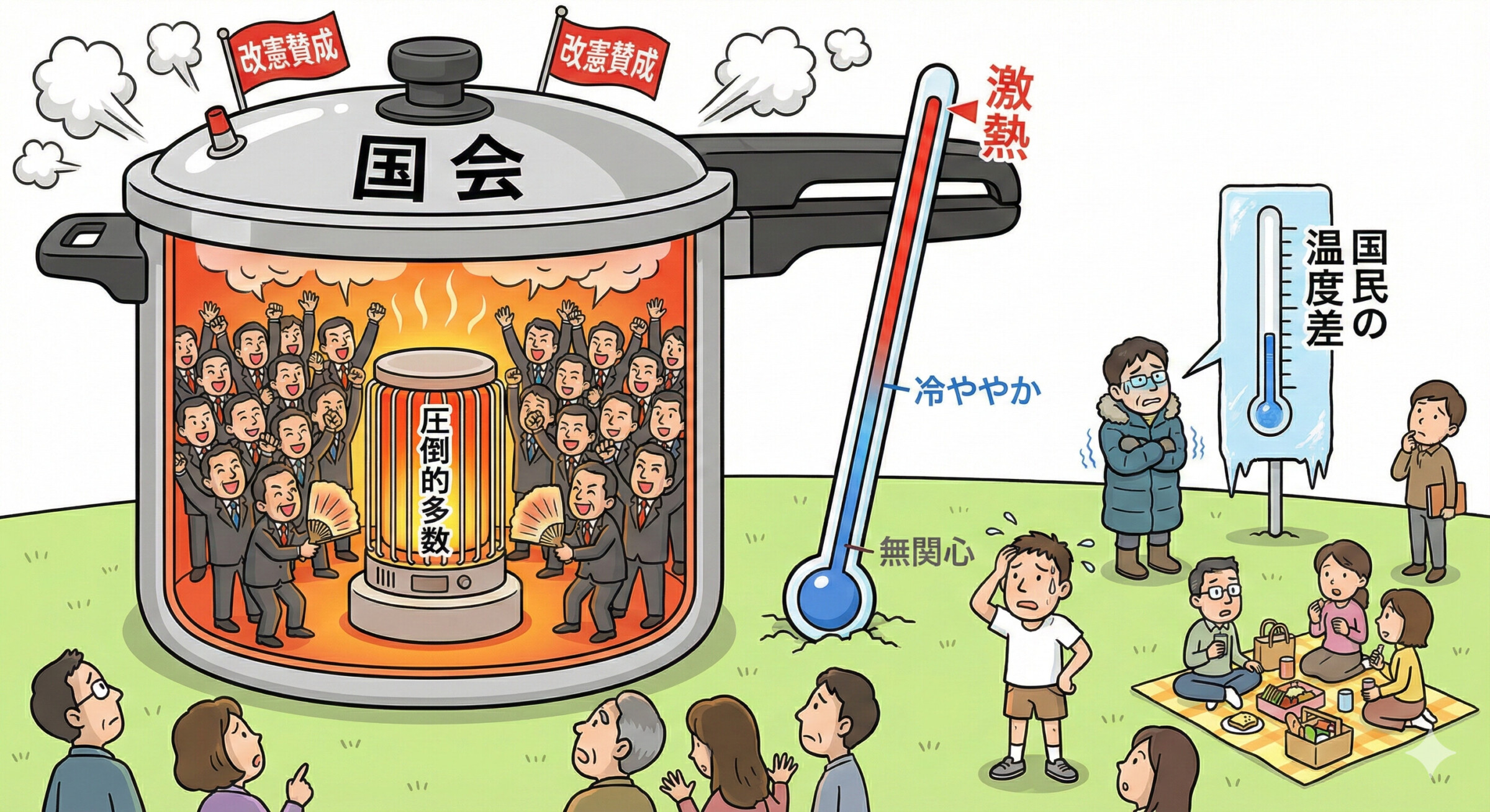 今回の衆院選において、自民党は単独で総定数の3分の2を超える316議席を獲得するという歴史的な勝利を収めました。これにより、憲法改正の発議に必要なハードルは衆議院において事実上消滅したと言っても過言ではありません。毎日新聞が実施した全当選者へのアンケートによれば、改憲に賛成と答えた議員は90パーセントに達し、反対派はわずか4パーセントという圧倒的な格差が浮き彫りになりました。かつて護憲派の声が響き渡った国会の風景は、今や一変しています。