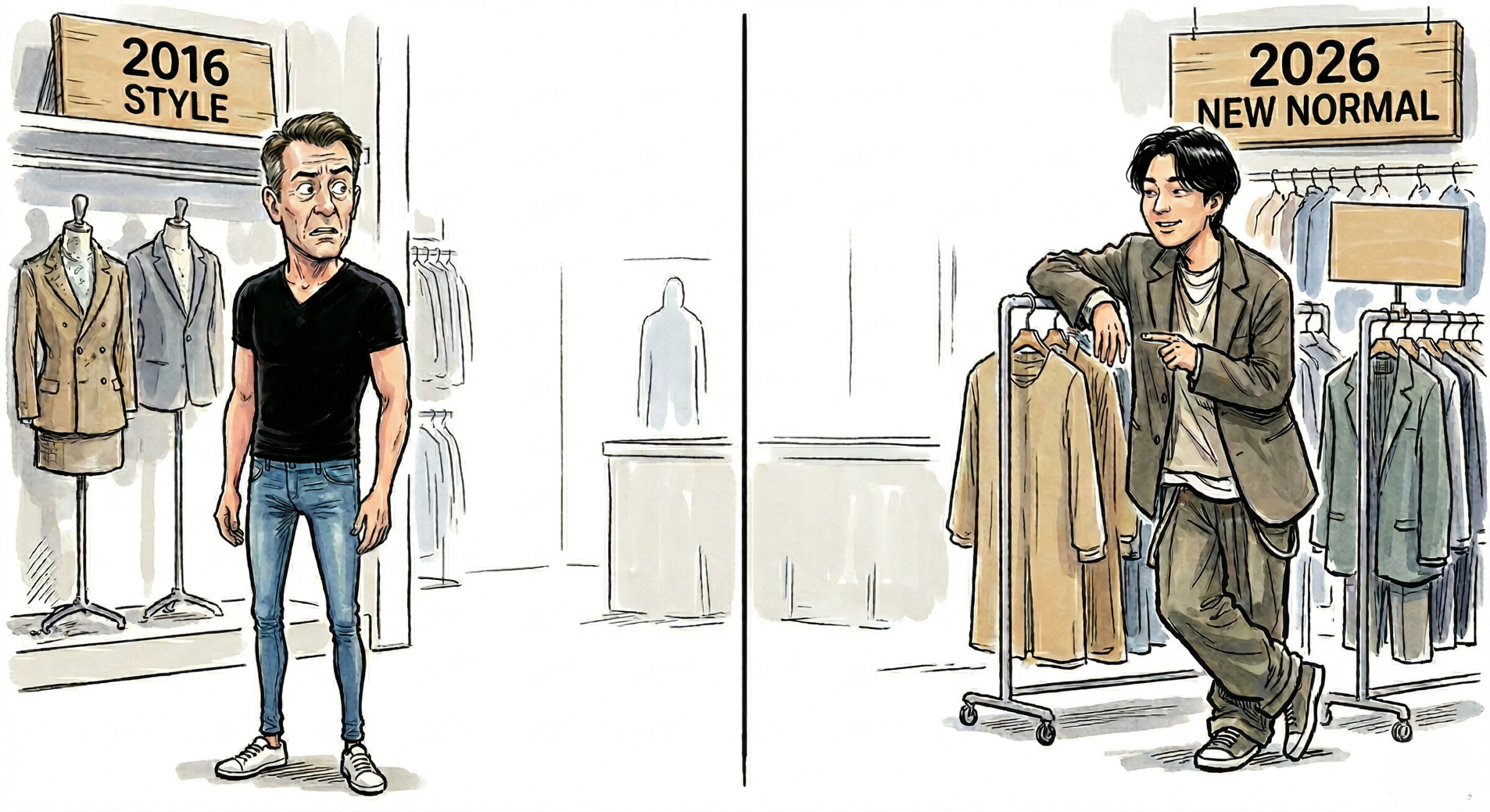 最新の知識を取り入れて外見をアップデートする楽しさがある反面、消費を促す流行の波に距離を置こうとする大人の理性が、現在のファッションシーンにおける新たな潮流となっているのかもしれません。