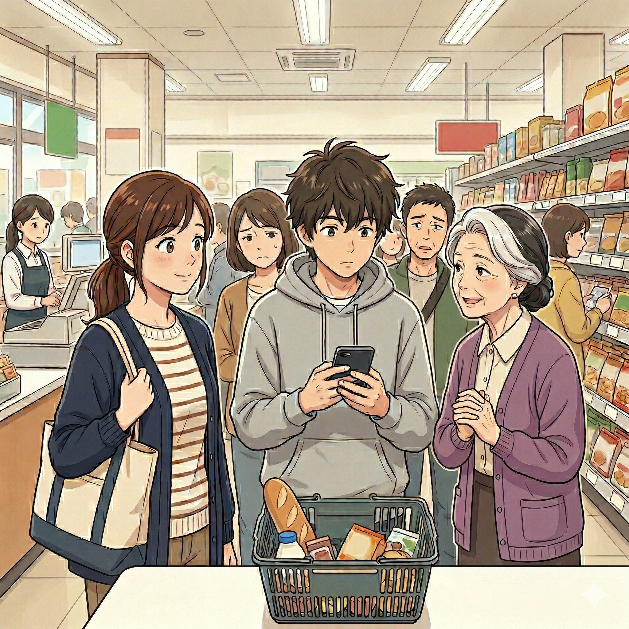 私の前に並んでいた若い男性が、会計を済ませたカゴを袋詰め台に置いたまま、熱心にスマホの画面を見つめているのです。