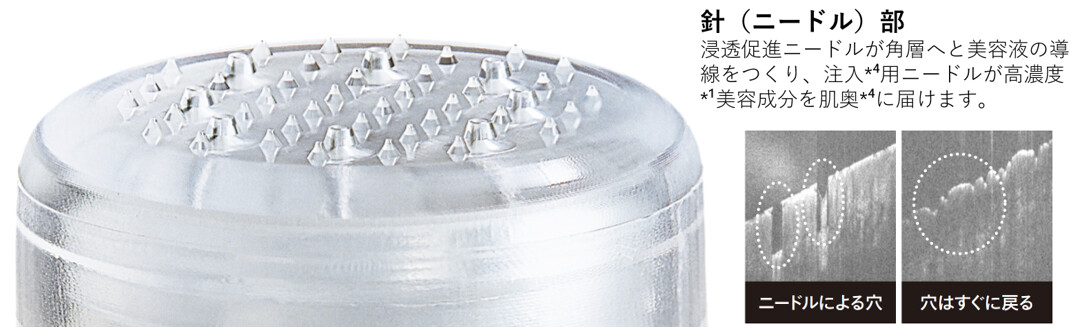 この商品の一番の特徴は、注入型マイクロニードル美容液であるところ。医療用のマイクロニードルから着想したもので、長さ200マイクロメートルの極細針が容器の先端部分に使われています。注射針のように中空構造になっていて、肌に当ててノックすると、美容液を角層内の奥に直接、注入することができるんです。新鮮なスキンケア体験ができますよ。
