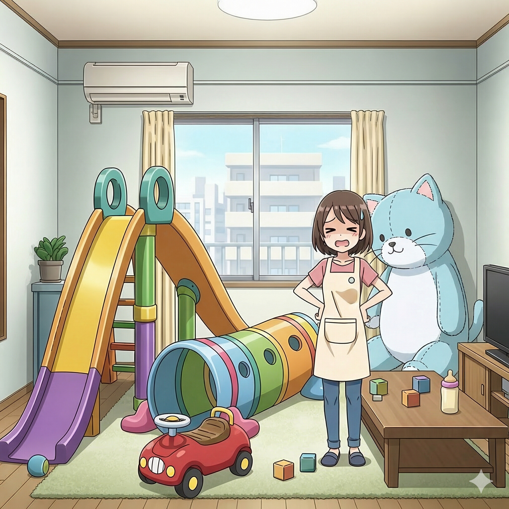 軽い気持ちで箱を開けた私は、思わず絶句。そこに入っていたのは、リビングの半分を占領しそうな、カラフルな滑り台とトンネルなどの巨大な室内遊具でした。