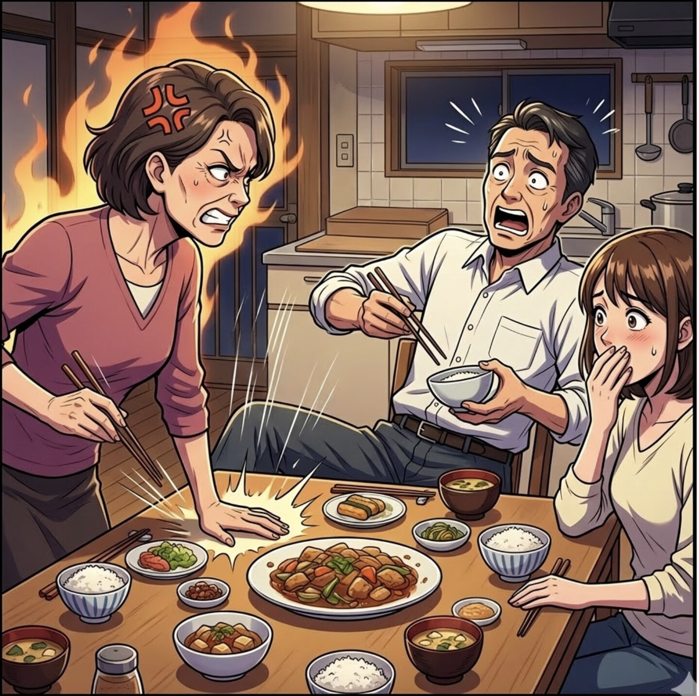 普段は温厚な母の、聞いたこともないような低い声。食卓の空気がピンと張り詰めます。