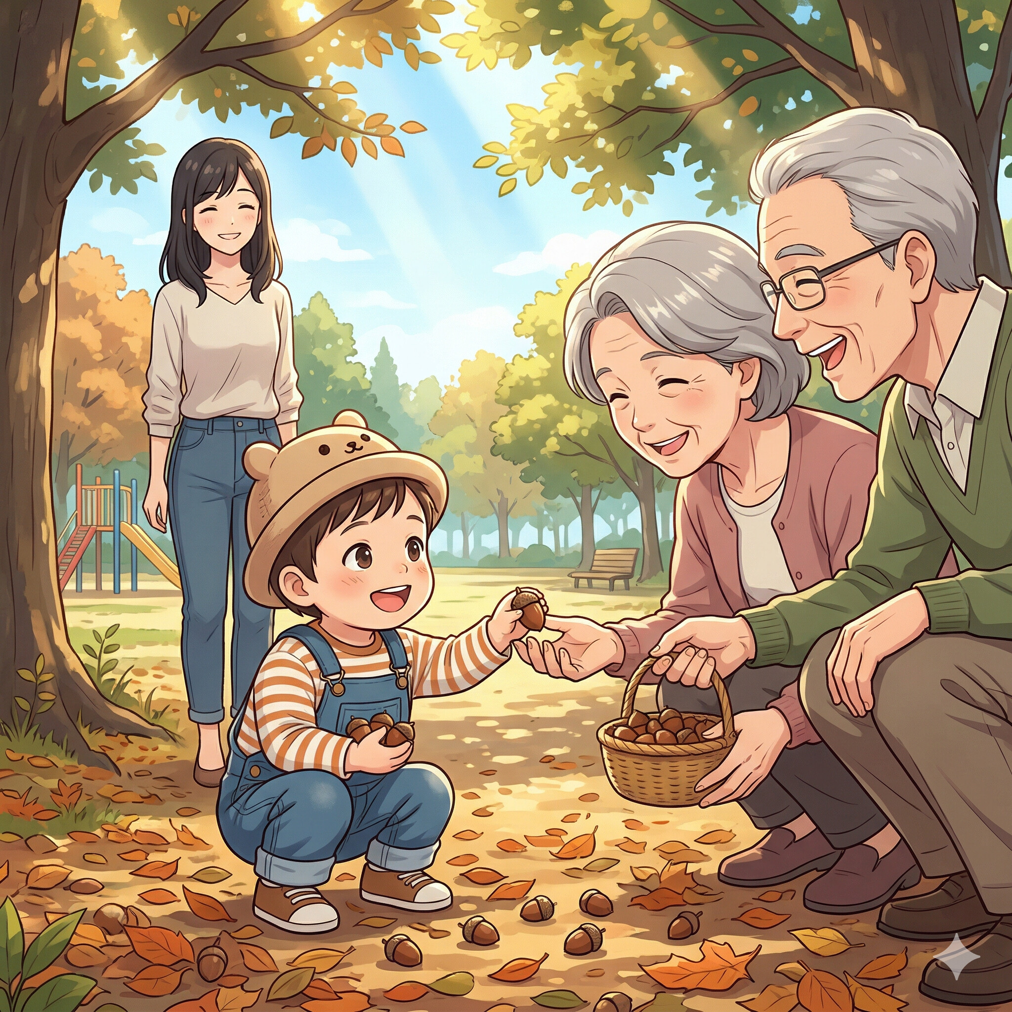 公園に着くや否や、息子は夢中で地面を這いつくばり、どんぐりを見つけては義両親の小さな手のひらに乗せていきます。