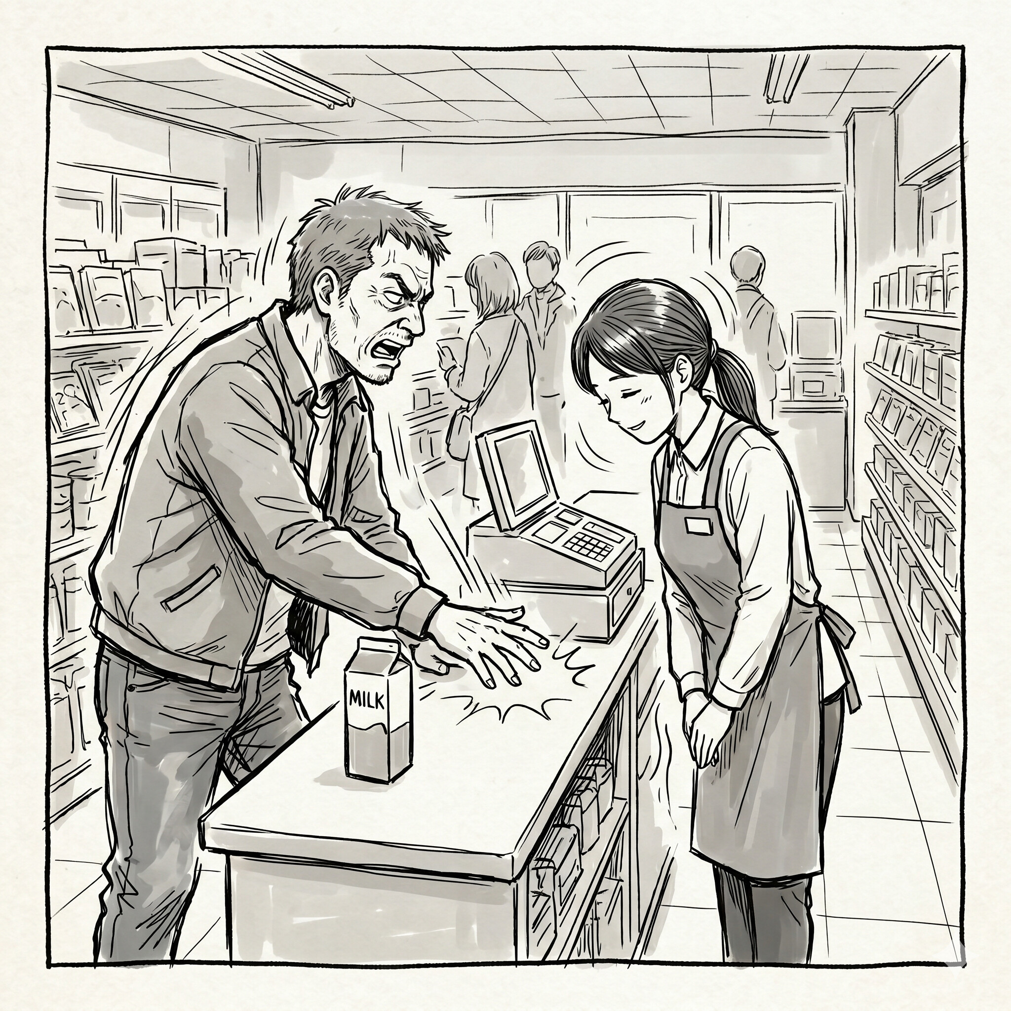 先ほどの剣幕はどこへやら。男性客は戸惑ったように小さく頷くと、お釣りを受け取り、逃げるように足早に店を後にしたのです。