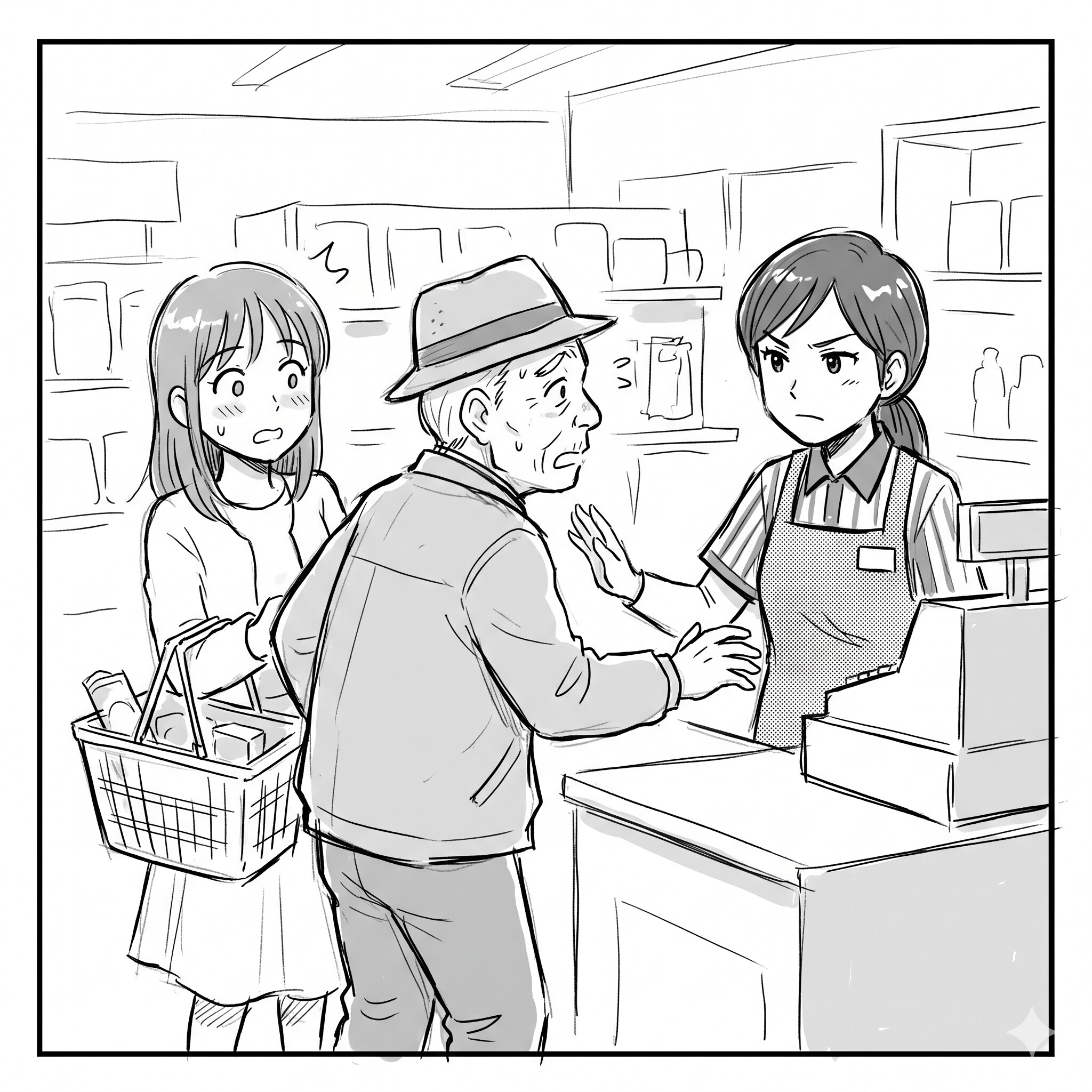 驚いて顔を上げると、そこには年配の男性の姿。手には商品が一つだけ握られています。