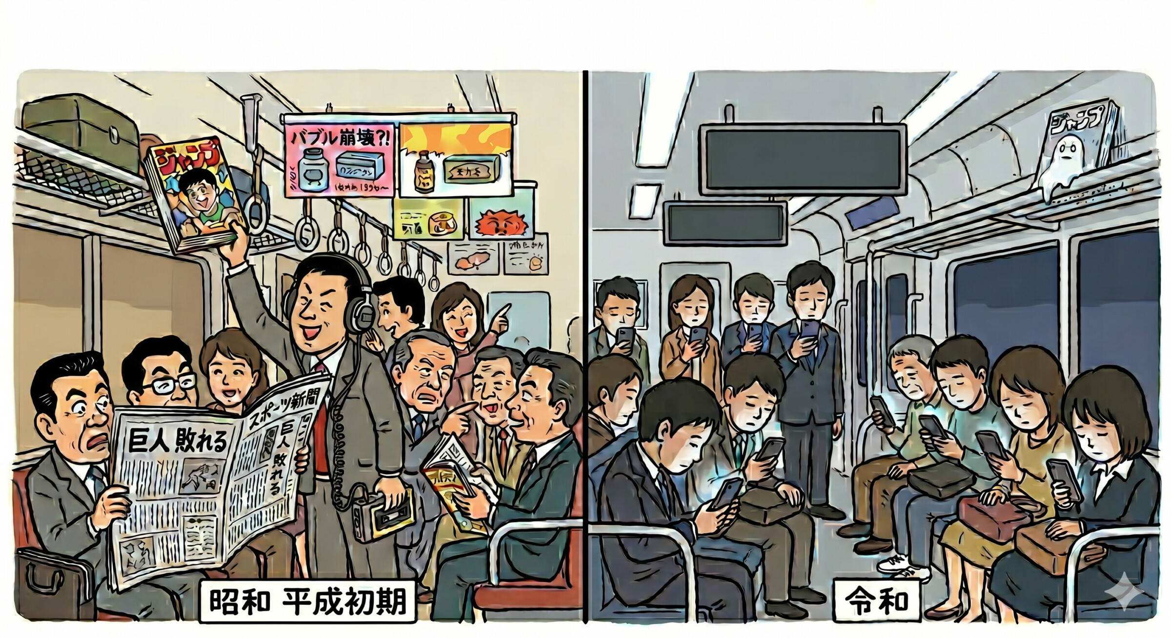 というエピソードが紹介され、見知らぬ誰かと情報を分け合った大らかな時代を懐かしむ声が目立ちました。駅の売店で買ったスポーツ新聞を器用に折りたたんで読む姿や、車内を彩る中吊り広告を眺めて時間を潰した記憶は、多くの人にとって共通の風景だったようです。