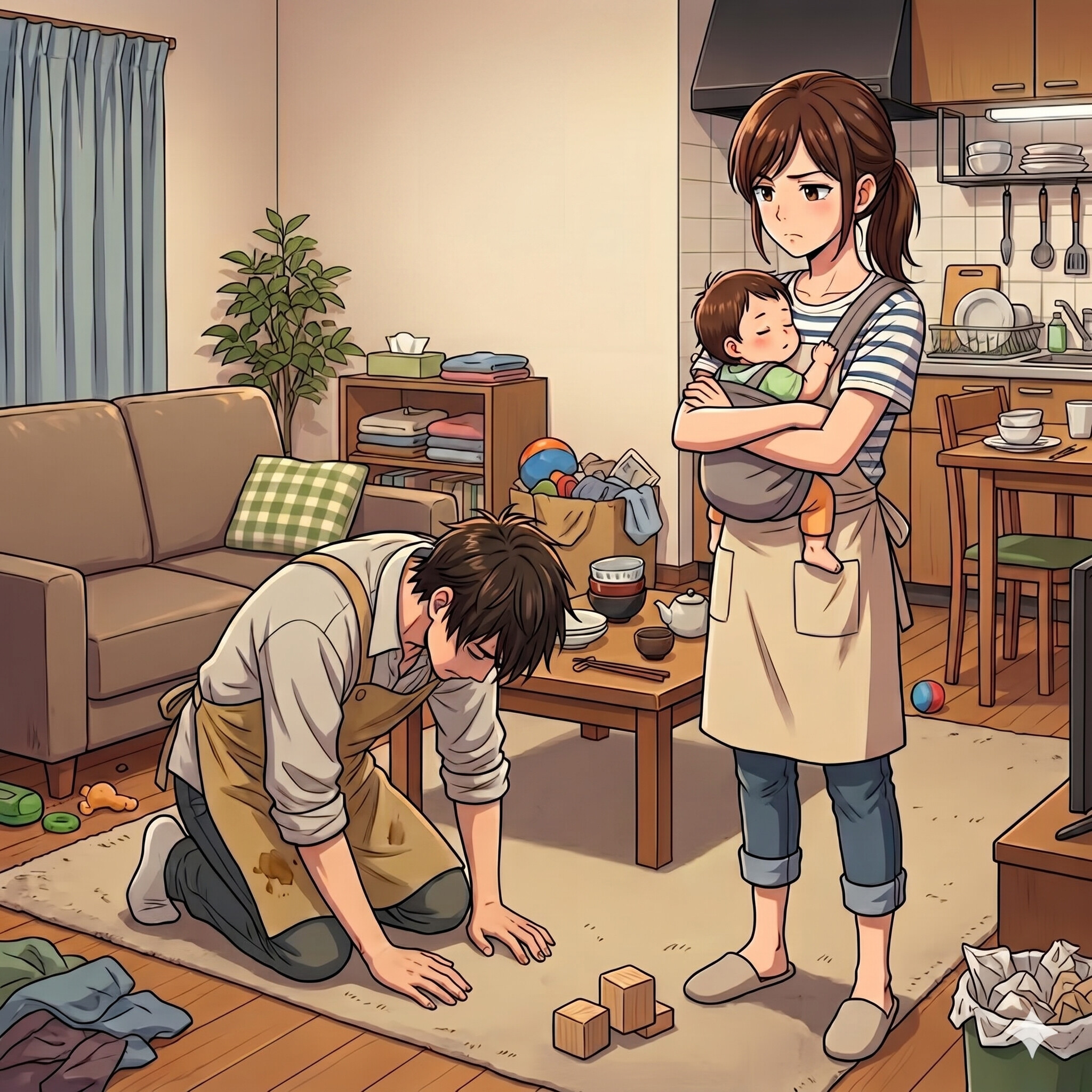 ぐうの音も出ない夫。彼はそのまま床に膝をつき、深々と頭を下げました。