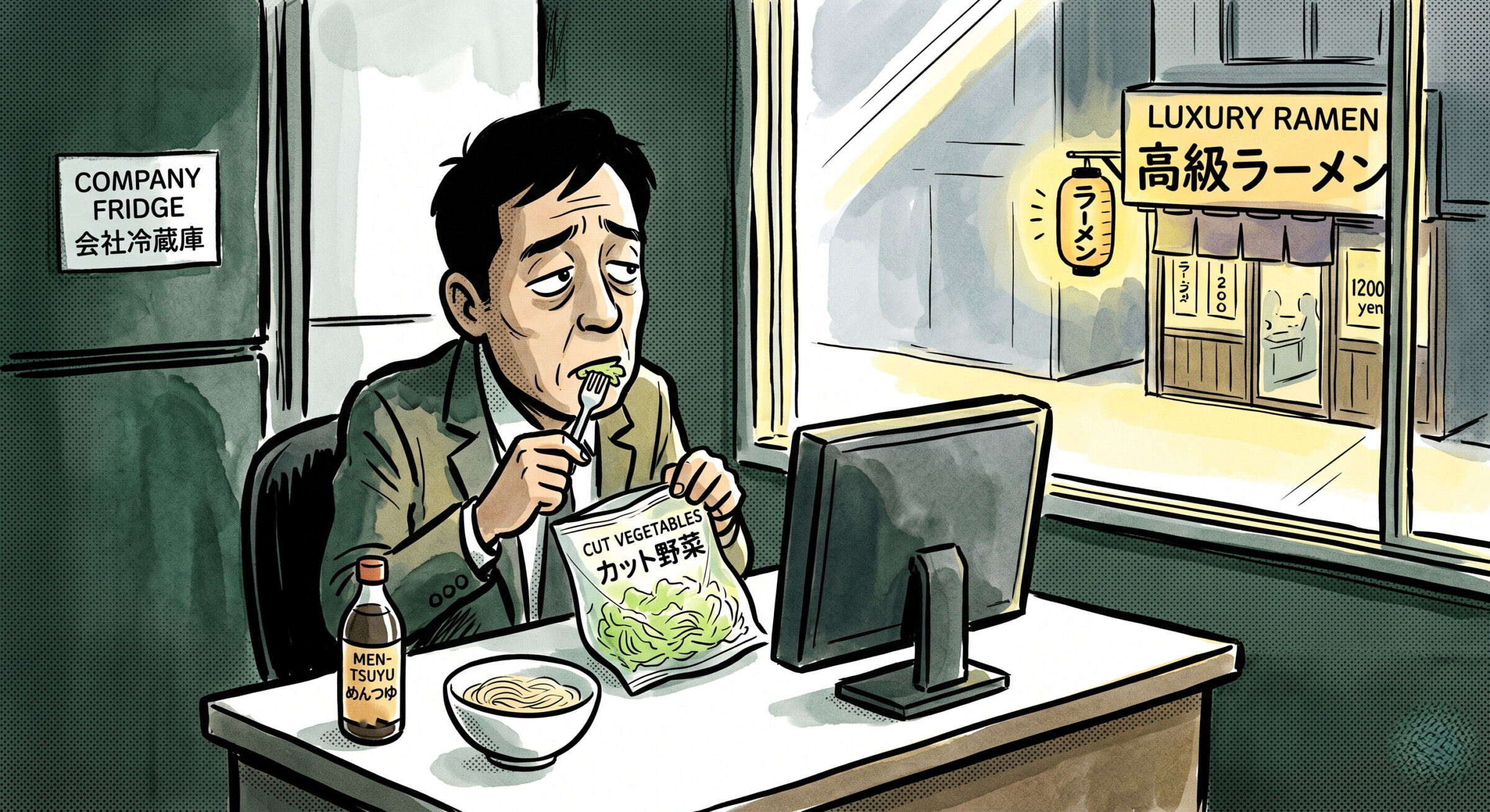 『スーパーでゆでうどんを買って、会社の冷蔵庫においてある自分の麺つゆで食べてる。1食だいたい100円ぐらい』