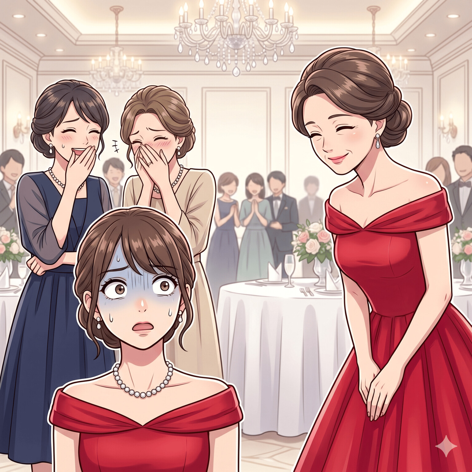 なんと、お母様が着ているドレスが、あの後輩のド派手な赤いドレスと「全く同じ色・デザイン」だったのです!