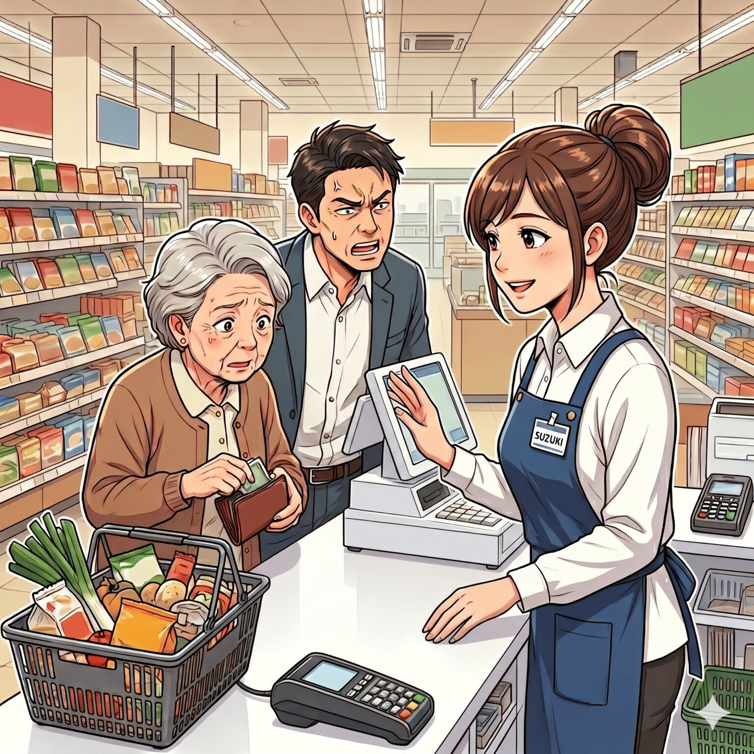 仕事帰りのスーパー。夕飯の惣菜を片手にレジの列に並んでいると、どうにも不穏な空気が漂っていました。