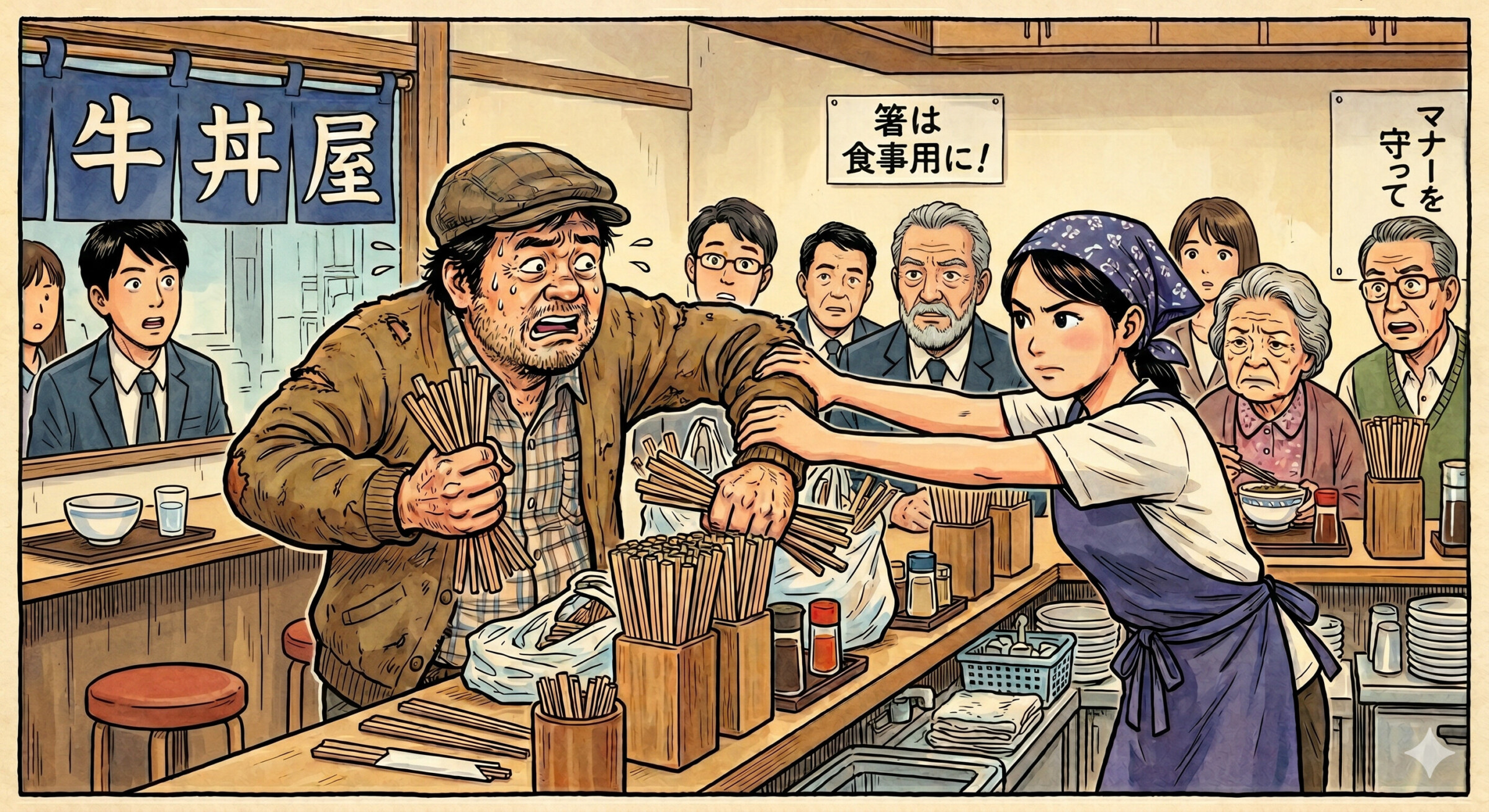 牛丼店で発生した割り箸の大量持ち出し騒動から、無料サービスの本来の目的と利用者のマナー、そして法的リスクの境界線を考察