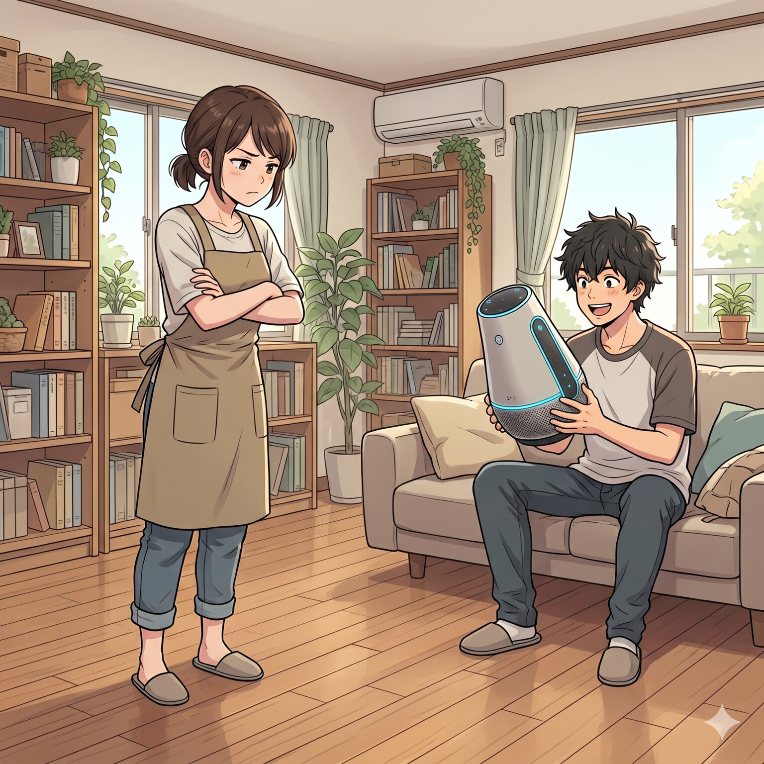 「おお、やっと届いたか!最新のスマート家電だよ。これで我が家の生活は劇的に豊かになるぞ!」